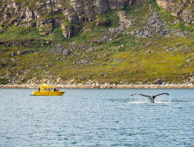 Every summer, from June to September, the whales return to Greenlandic waters to feed on krill and small fish. They can often be seen up close, lifting their distinctive tails above the surface or gliding gracefully past the boat. Many visitors describe the experience as almost spiritual – a quiet, awe-inspiring reminder of nature’s power.